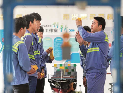 浙江省海港集团、宁波舟山港集团宁波北仑第三集装箱船埠有限公司桥吊班大班长竺士杰,在为门徒和实习学员训诲“竺士杰桥吊操作法”。(图/王鹏)
