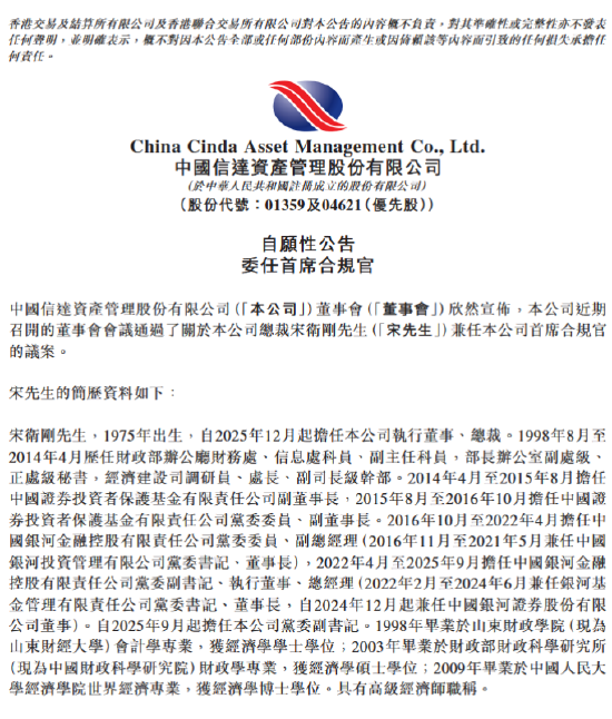 4月9日金融一线讯息,中国信达当天发布公告称,公司近期召开的董事会会议通过了对于总裁宋卫刚兼任公司首席合规官的议案。
