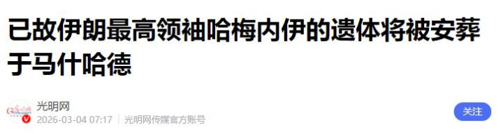 已故伊朗最高首级哈梅内伊的遗体将被安葬于马什哈德——光明网