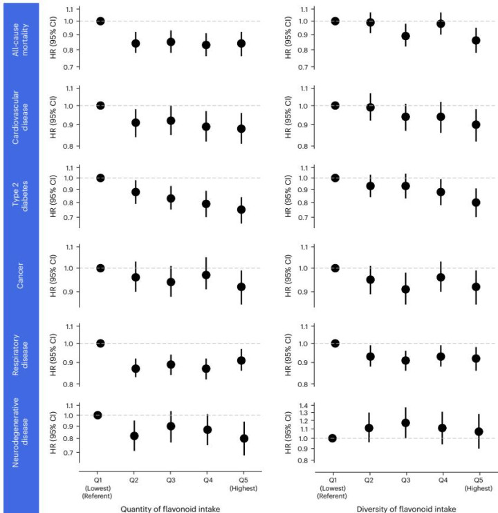 2025年发表在《Nature Food》上的这项大型队伍商量,初度通过UK Biobank数据库,揭示了膳食类黄酮摄入的种种性(而不仅是数目)与全因亏蚀率及多种慢性疾病风险的零丁干系。这不仅颠覆了“越多越好”的传统领略,更为各人健康饮食指南提供了新标的。