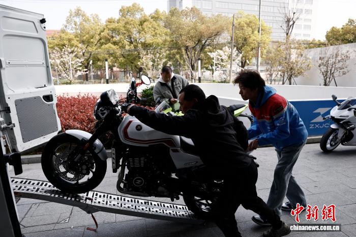 乐鱼体育官网位于上海市宝山区丰翔路1302号张雪机车 (上海宝山店)外,伙计和责任主说念主员全部将已售车辆转运至指定上牌处。中新社记者 殷立勤 摄 " />