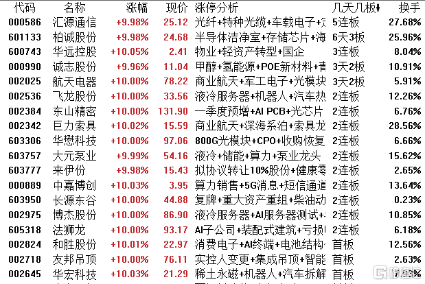 高位股方面,光纤宗旨股汇源通讯5连板,柏诚股份6天3板,华远控股3连板。诚志股份、航天电器3天2板,飞龙股份、东山精密、巨力索具等2连板。