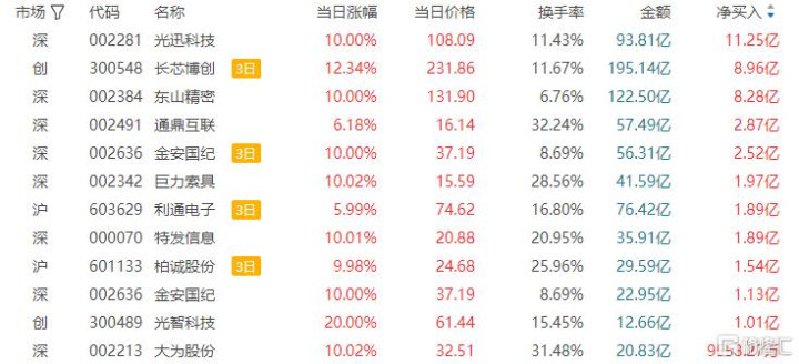 龙虎榜单日净买入额前三为光迅科技、东山精密、通鼎互联,折柳为11.25亿元、8.28亿元、2.87亿元。