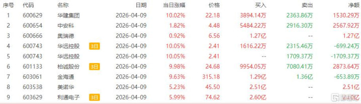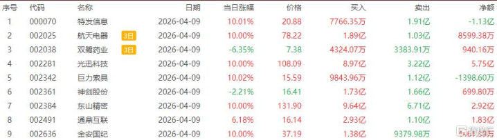 成齐系:净买入特发信息9985万元;净卖出铭普光磁5049万元、奥瑞德8327万元