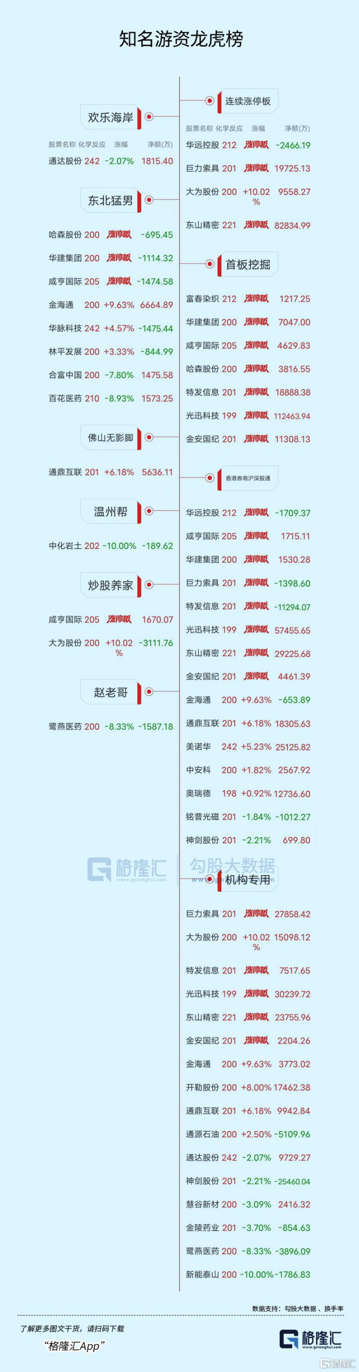 龙虎榜中波及机构专用席位的个股中,当日净买入额前三为东山精密、光迅科技、巨力索具,折柳为2.38亿元、2.18亿元、1.39亿元。