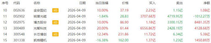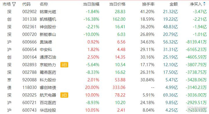龙虎榜单日净卖出额前三为铭普光磁、凯格精机、神剑股份,折柳为3.47亿元、2.21亿元、1.94亿元。