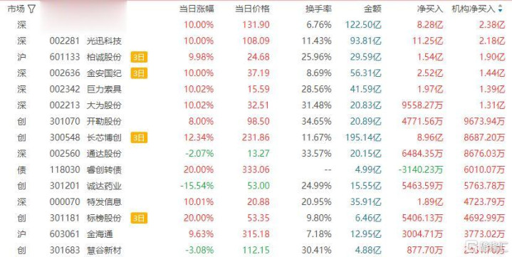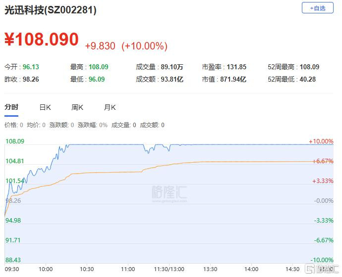 光迅科技:当天涨停,全天换手率11.43%,成交额93.81亿元,振幅12.49%。龙虎榜数据露出,机构净买入2.18亿元,深股通净买入5.75亿元,营业部席位共计净买入3.32亿元。