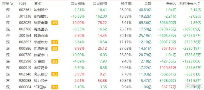 龙虎榜中波及机构专用席位的个股中,当日净卖出额前三为神剑股份、凯格精机、鹭燕医药,折柳为2.14亿元、2.02亿元、3896.09万元。