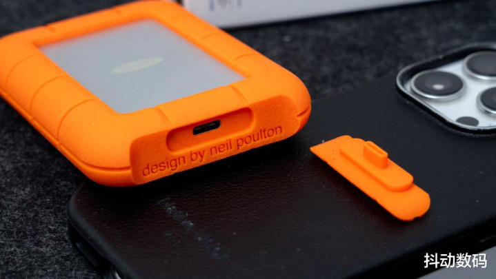 硬盘尺寸不大,好像105x67x17mm,仅手掌大小。雷孜LaCie Rugged SSD4金刚钻Plus继承坚固的金属材质外壳,外覆一圈驻扎标橘色橡胶防护套。外壳旯旮继承圆弧倒角盘算,橡胶防护套名义另设有防滑凹槽纹理。