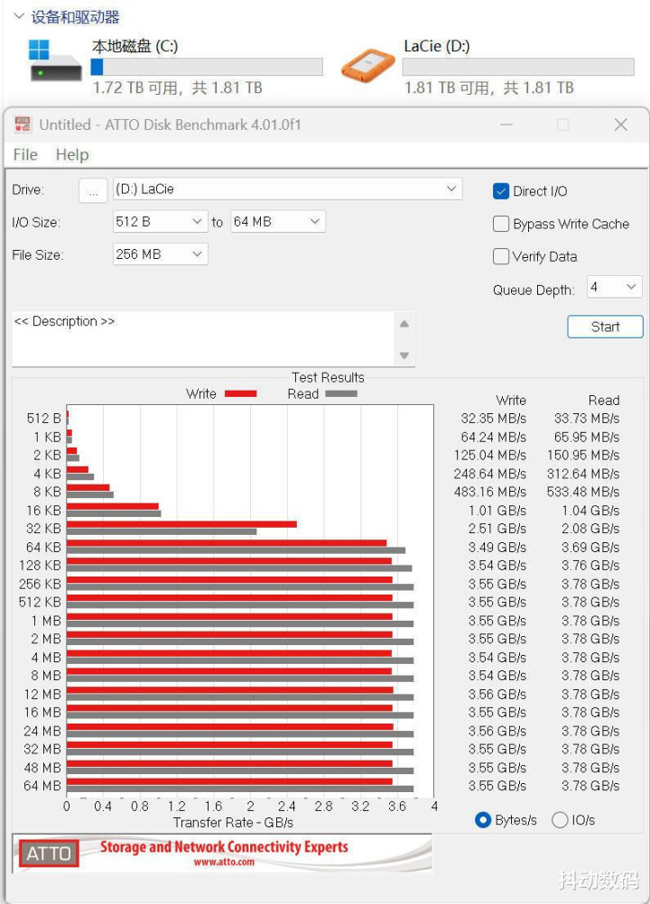 ATTO测试雷孜LaCie Rugged SSD4金刚钻Plus读写测试,不同数据块大小的章程读写性能。不错看到跟着数据块增大到64K时,LaCie Rugged SSD4的读写速率就照旧不错稳固在3.5 GB/s以上,后续读写速率稳固,未见明显波动。