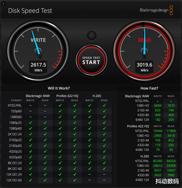 Blackmagic Disk Speed Test软件下,写入2617.5 MB/s、读取速率为3019.6 MB/s。