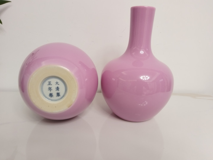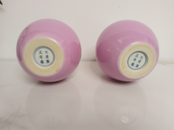 这对天球瓶以雍正朝象征性的淡粉釉秘密,釉色匀净端淑,如淡紫云霞凝于瓷身。天球瓶造型工艺难度极高,需把控圆腹与细颈的比例,烧制时极易变形,成对保存完整更显贫寒。底部 “大清雍正年制” 青花款识,字体规整,是雍正官窑器的身份印证,也体现了其时制瓷工艺的严谨性。