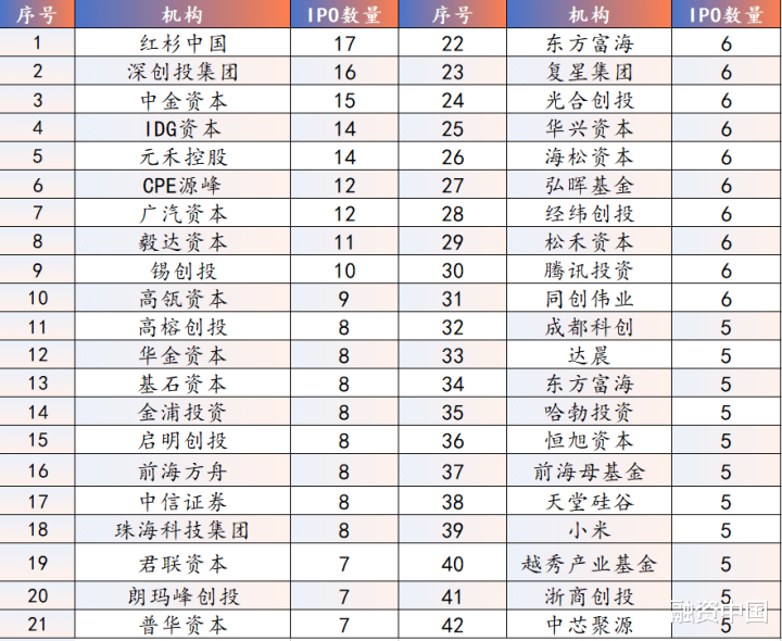 本年,得益杰出5个IPO名标的机构共42家,杰出十个IPO名标的共9家。其中,红杉、深创投、中金老本以17、16、15个IPO数目分列状元、榜眼及探花。三甲机构数目收支均1家,可见本年IPO赛的强烈进度。