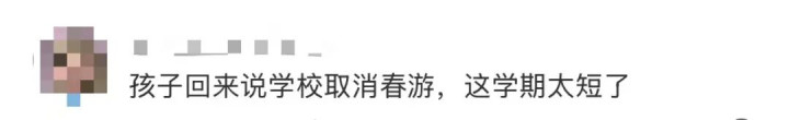 另一位家长径直晒出孩子回家带的口信:学校取消春游,事理等于“这学期太短”。